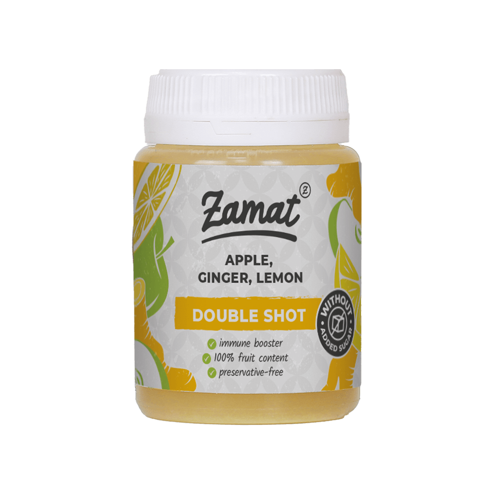 Ingredients: apple juice, lemon juice, ginger root. Made without added sugar. Contains no preservatives or allergens. 100% fruit content.
