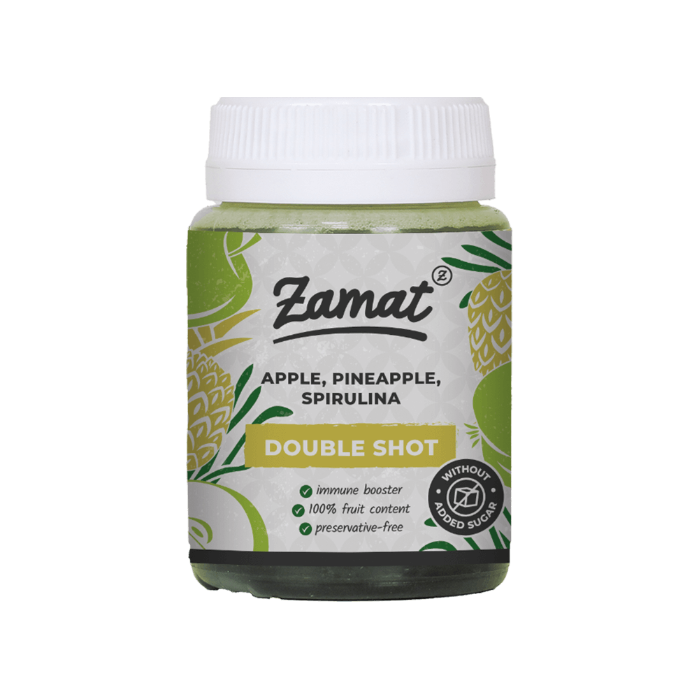 Ingredients: apple juice, pineapple juice, spirulina. Made without added sugar. Contains no preservatives or allergens. 100% fruit content.