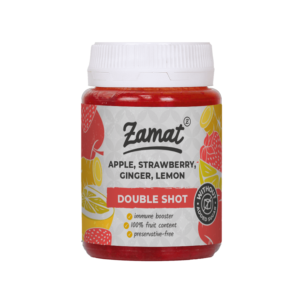 Ingredients: apple juice, frozen strawberries, ginger root, lemon juice. Made without added sugar. Contains no preservatives or allergens. 100% fruit content.