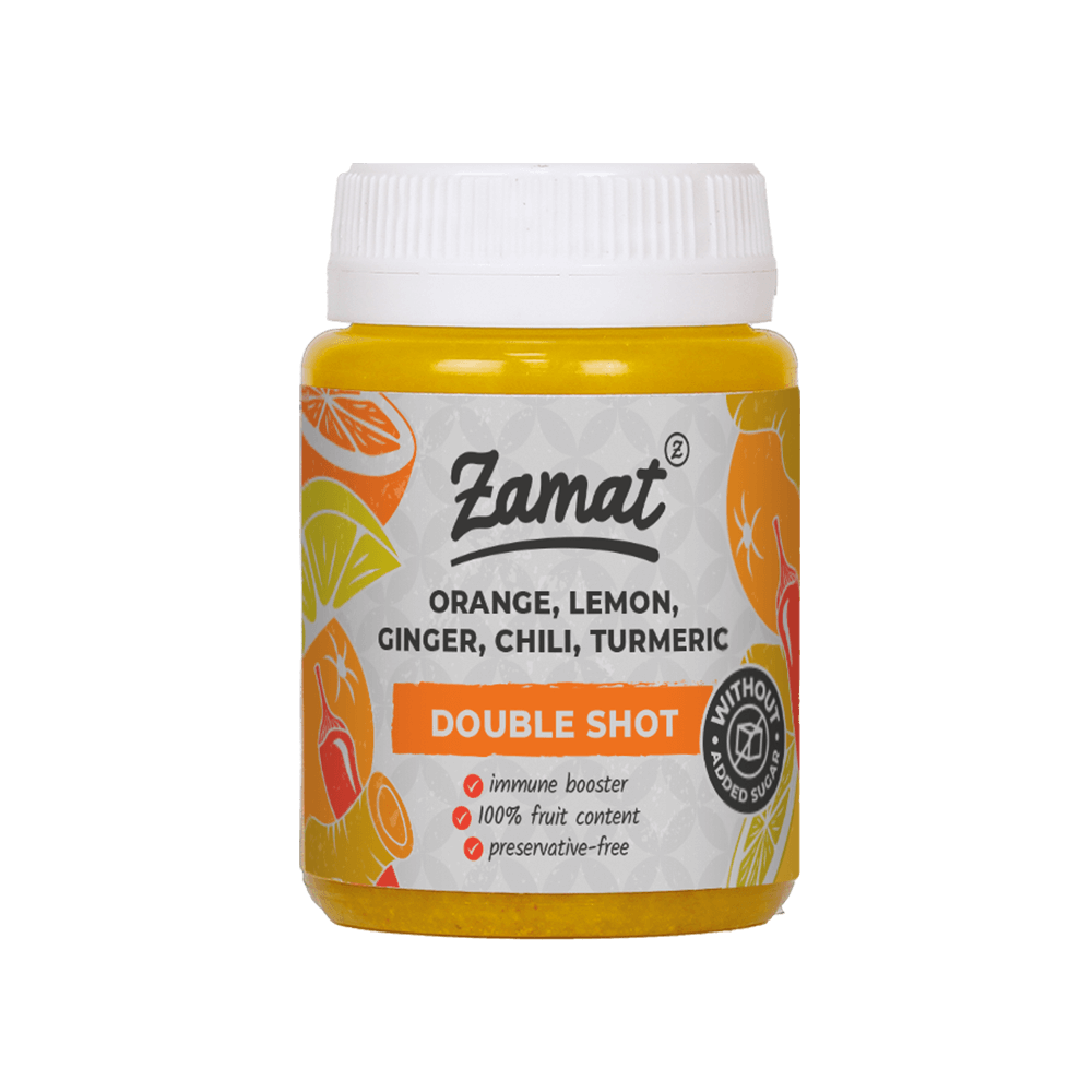 Ingredients: orange juice, lemon juice, ginger root, ground turmeric, cayenne pepper. Made without added sugar. Contains no preservatives or allergens. 100% fruit content.
